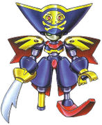 In battle he serves more of a dominant melee role, but can also serve as minor shooting support. His head part is a Gatling attack that is relatively weak and very easy to evade. In compensation however, he has 30 head uses. His right arm, and strongest weapon, is a Sword attack with chain damage, allowing him to be able to severely damage if not cripple an opponent. His left arm is a balanced Hammer attack that is not as powerful as his sword, but still able to pack a punch. Overall Kaizokuro has very good armor ratings, making him a good medabot to have an any team that wants balanced attacking and armor.