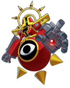 Omega Tale is a red and gold medarot with a strong design motif of the Greek Letter Omega (Ω). Its head is dome-shaped with a black opening shaped like the letter with a single green eye in it. Its torso is round with a black gap in the middle with a set of pointy teeth floating in it and a halo in the shape of a wireframe Omega with spikes on top mounted on the back of its shoulders. The Leg part is another sphere with a black void with an eye in it that connects to horizontal plates at the hips forming an inverted Omega shape, with three disconnected spikes floating below it pointing toward the ground. The arms are the same in design, featuring square shoulders, thin upper arms, and boxy forearms with bladelike heat sinks on the outside. Its hands are blocky and each one has a red gem/lens in the middle of the palm which emits its beam attacks.