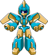 Skycargo is a bipedal Medabot, mainly pale blue and yellow in color. It has yellow wing-like attachments on the backs of its shoulders, and small jet engines placed above its hands on both arms. Its eyes are covered by a dark blue visor, with a yellow fin on the top of its head.